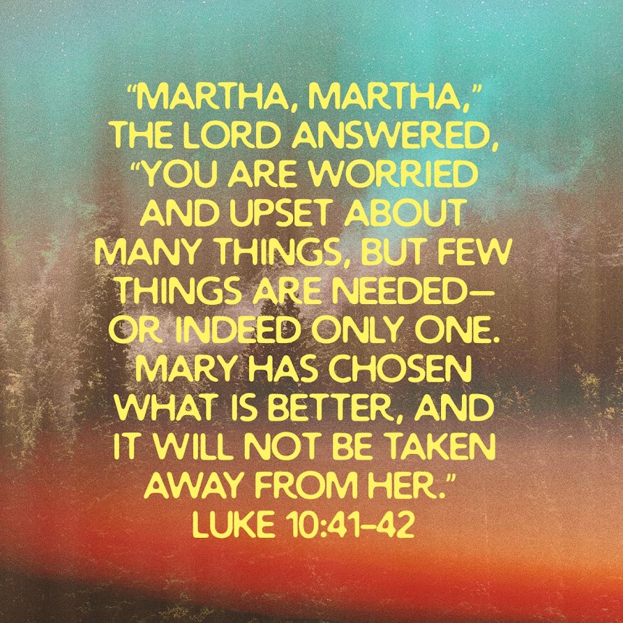 “Martha, Martha,” the Lord answered, “you are worried and upset about many things, but few things are needed—or indeed only one.10:42 Some manuscripts, but only one thing is needed Mary has chosen what is better, and it will not be taken away from her.”
