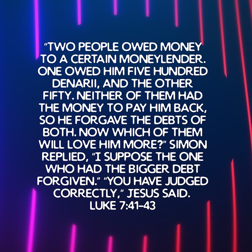 That’s when Jesus tells Simon the parable. If you haven’t figured it out, the woman is the person with the more significant debt, Simon is the one with the smaller one.