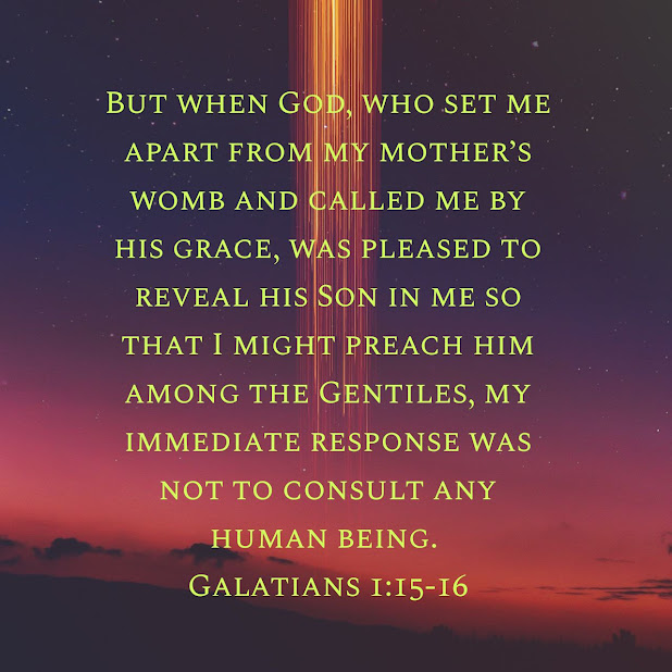 For you have heard of my previous Way of life in Judaism, how intensely I persecuted the church of God and tried to destroy it. I was advancing in Judaism beyond many of my own age among my people and was extremely zealous for the traditions of my fathers. But when God, who set me apart from my mother’s womb and called me by his grace, was pleased to reveal his Son in me so that I might preach him among the Gentiles, my immediate response was not to consult any human being. I did not go up to Jerusalem to see those who were apostles before I was, but I went into Arabia. Later I returned to Damascus.