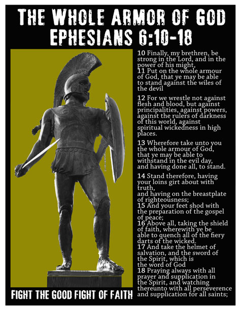 “Finally, be strong in the Lord and in his mighty power. Put on the full armor of God so that you can take your stand against the devil’s schemes. For our struggle is not against flesh and blood but against the rulers, against the authorities, against the powers of this dark world, and against the spiritual forces of evil in the heavenly realms. Therefore, put on the full armor of God so that when the day of evil comes, you may be able to stand your ground and, after you have done everything, to stand. Stand firm then, with the belt of truth buckled around your waist, with the breastplate of righteousness in place, and with your feet fitted with the readiness that comes from the (gospel of peace). In addition to all this, take up the shield of faith, with which you can extinguish all the flaming arrows of the evil one. Take the helmet of salvation and the sword of the Spirit, which is the word of God.
